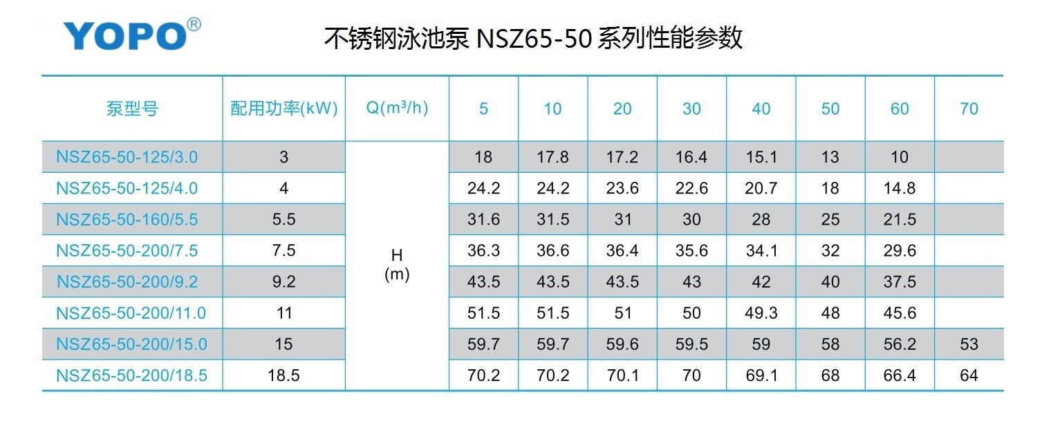 YOPO不锈钢泳池泵NSZ65-50系列性能参数